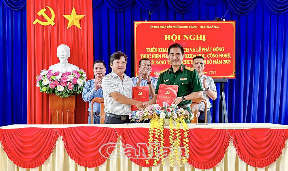 Ông Trần Quang Vinh, Phó Chủ tịch UBND phường Hoà Thành và Thượng tá Phạm Văn Phúc, Phó Giám đốc Khách hàng Doanh nghiệp Viettel Cà Mau, trao đổi bản ghi nhớ hợp tác về CĐS trên địa bàn phường. (Ảnh: Anh Tuấn)