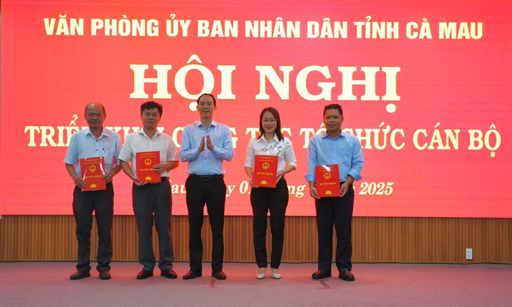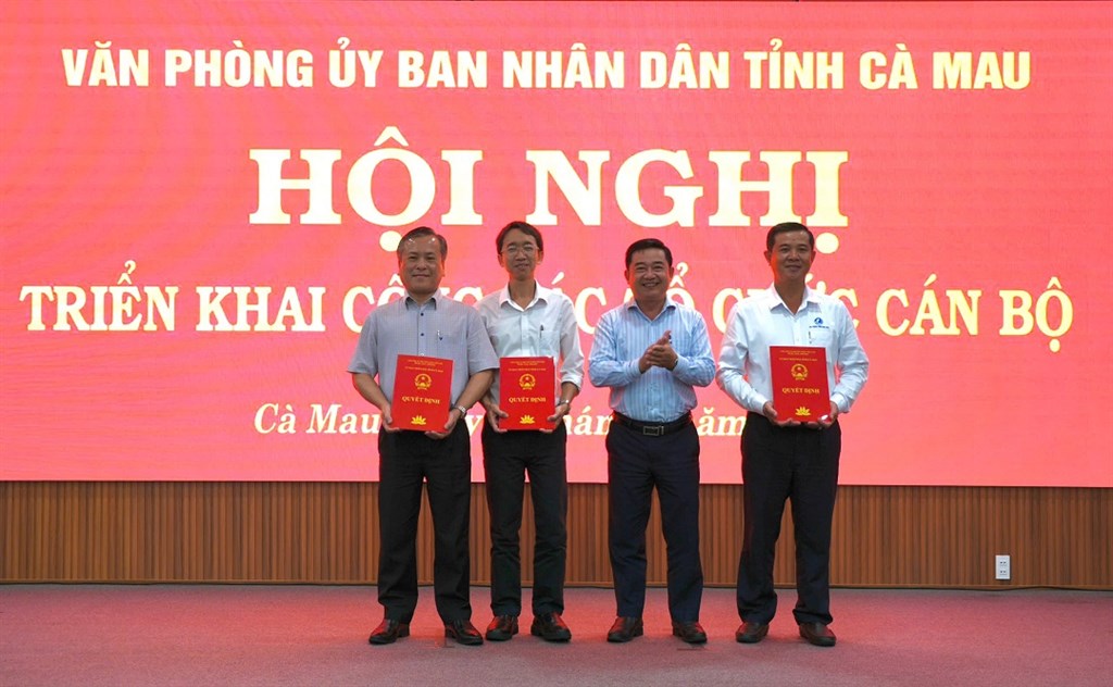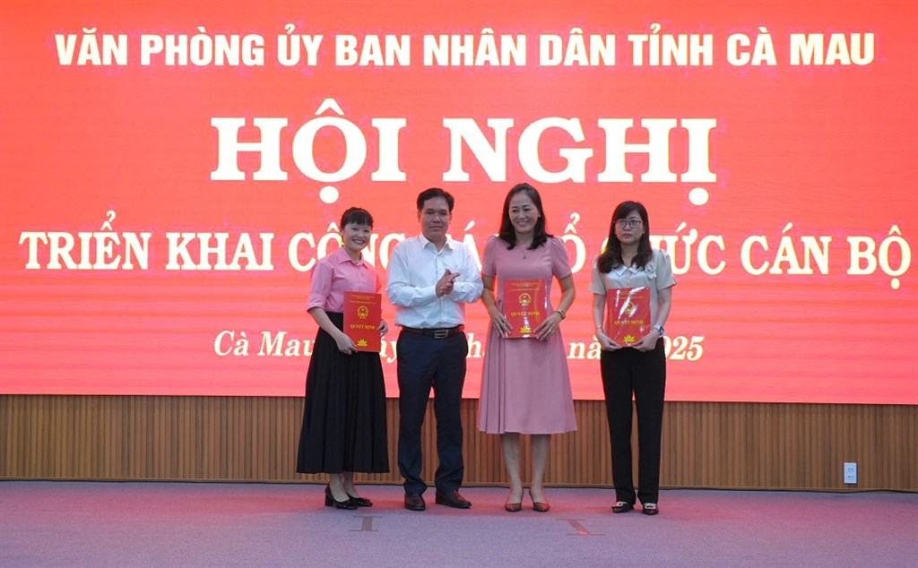 Công bố Quyết định của Chánh Văn phòng UBND tỉnh về việc bổ nhiệm công chức giữ chức vụ lãnh đạo, quản lí cấp phòng và các đơn vị thuộc Văn phòng UBND tỉnh, gồm: Trung tâm Phục vụ hành chính công, Cổng Thông tin điện tử, Nhà khách Cà Mau và các Phòng: Hành chính - Tổ chức, Quản trị - Tài vụ, Kinh tế tổng hợp, Nông nghiệp - Xây dựng, Nội chính, Khoa giáo - Văn xã, Ngoại vụ.