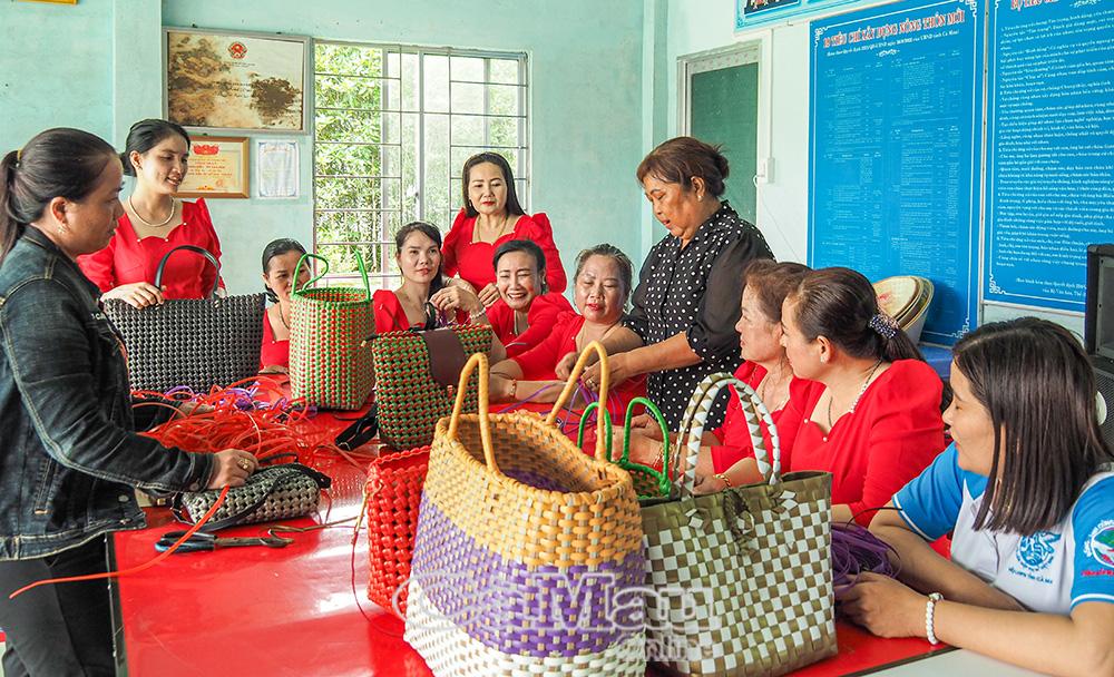 Tạo cơ hội việc làm, khởi nghiệp có thu nhập ổn định và cuộc sống bền vững (Lớp truyền nghề đan giỏ nhựa của Hội LHPN xã Đất Mũi).
