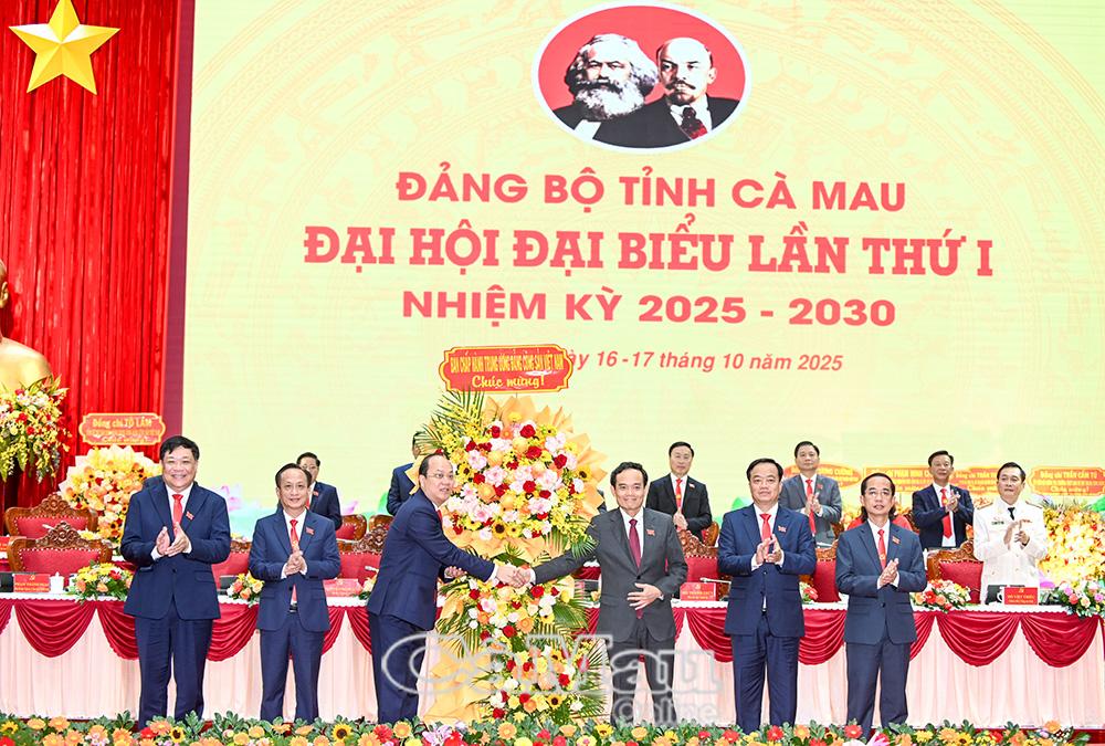 Đồng chí Trần Lưu Quang, Bí thư Trung ương Đảng, Bí thư Thành uỷ TP Hồ Chí Minh và và đồng chí Nguyễn Quang Dương, Uỷ viên Ban Chấp hành Trung ương Đảng, Phó Trưởng Ban Tổ chức Trung ương, tặng hoa chúc mừng các đồng chí được Bộ Chính trị chỉ định tham gia Ban Chấp hành Đảng bộ tỉnh Cà Mau khóa I, nhiệm kỳ 2025-2030.