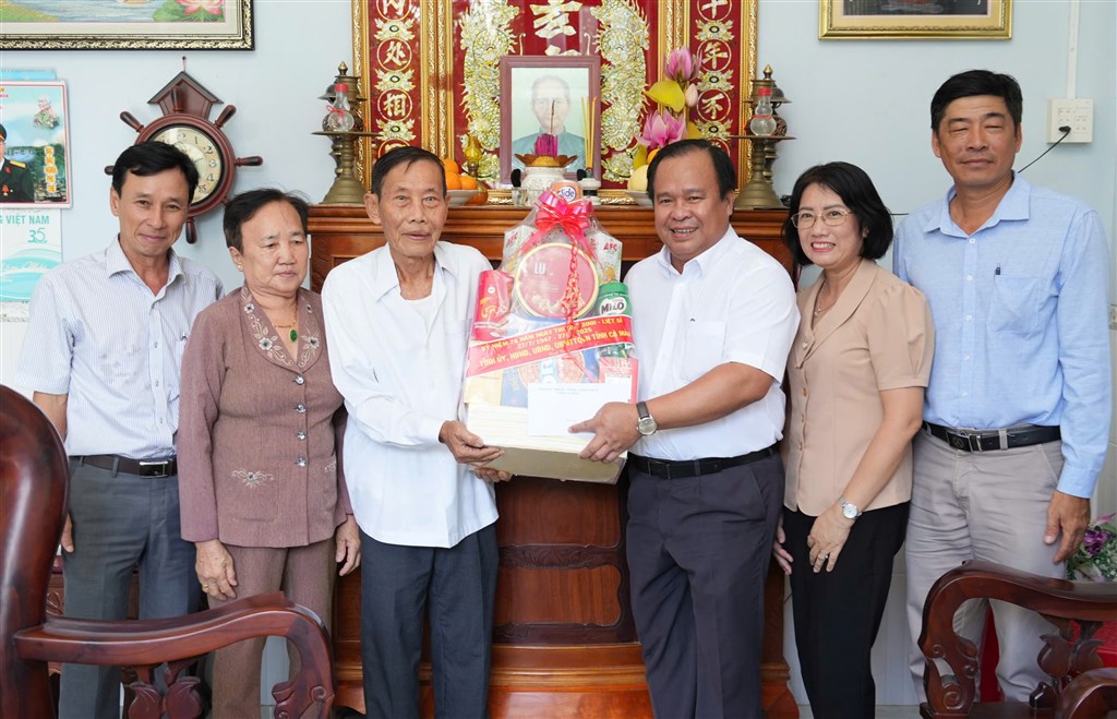 Phó Chủ tịch UBND tỉnh Nguyễn Minh Luân (thứ 3 từ bên phải) tặng quà cho thương binh Nguyễn Văn Thạnh.