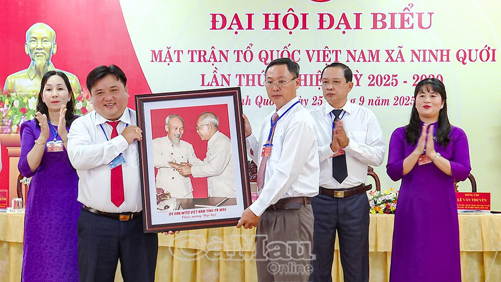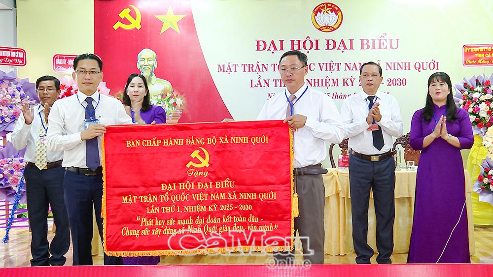 Đồng chí Nguyễn Minh Nhựt, Bí thư Đảng uỷ xã Ninh Quới, trao tặng Đại hội bức trướng với dòng chữ “Phát huy sức mạnh đại đoàn kết toàn dân- Chung sức xây dựng xã Ninh Quới giàu đẹp văn minh".