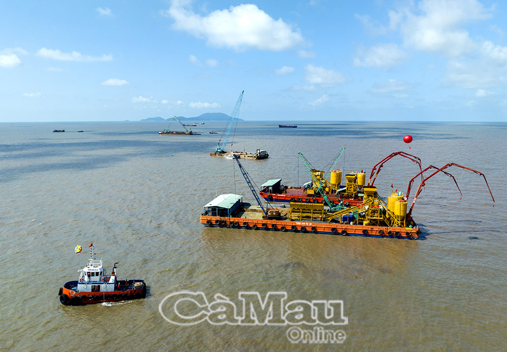 Phát huy lợi thế, tiềm năng tuyến giao thông ra đảo Hòn Khoai; Cảng tổng hợp lưỡng dụng Hòn Khoai, xã Đất Mũi sẽ bứt phá phát triển. (Trong ảnh: Công trình xây dựng cầu vượt biển nối liền Đất Mũi - Hòn Khoai vừa khởi công xây dựng ngày 19/8).
