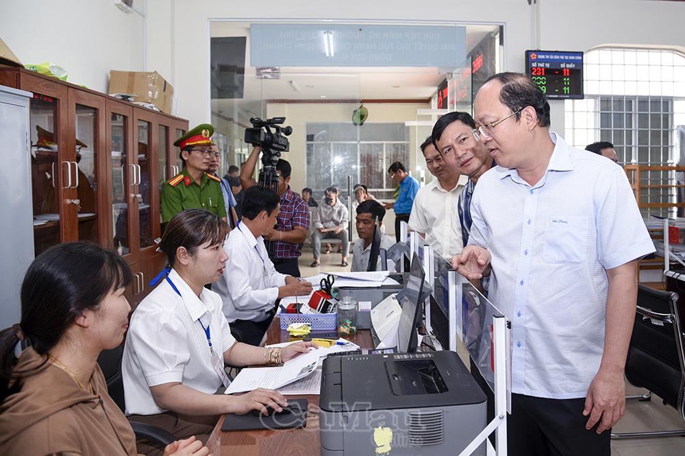 Bí thư Tỉnh uỷ Nguyễn Hồ Hải nắm phương thức giải quyết thủ tục hành chính của công chức Trung tâm Phục vụ hành chính công xã Vĩnh Lợi.