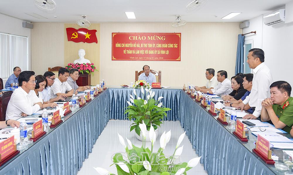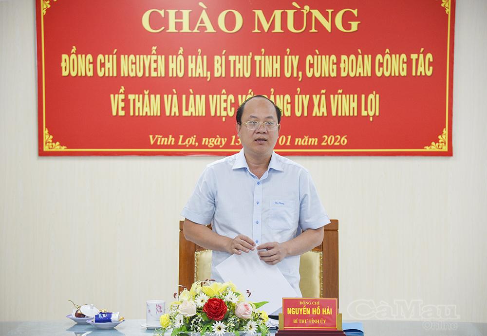 Bí thư Tỉnh uỷ Nguyễn Hồ Hải cũng yêu cầu xã Vĩnh Lợi bám sát sự chỉ đạo của Trung ương và Tỉnh uỷ trong công tác chuẩn bị và tổ chức bầu cử đại biểu Quốc hội khoá XVI và HĐND các cấp nhiệm kỳ 2026-2031; đồng thời chăm lo tốt các hoạt động mừng Đảng - mừng Xuân Bính Ngọ 2026, quan tâm các gia đình chính sách, hộ nghèo, người có hoàn cảnh khó khăn.