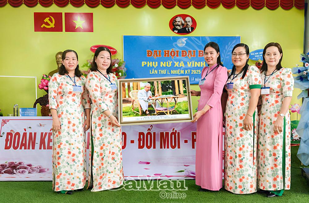 Đồng chí Tô Thị Mỹ Thuận, Phó Chủ tịch Thường trực Hội LHPN tỉnh Cà Mau, tặng bức tranh lãnh tụ Hồ Chí Minh chúc mừng Đại hội.