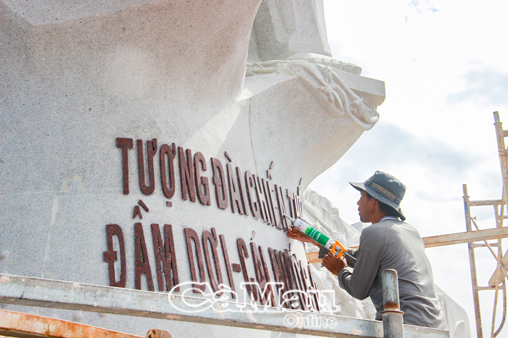 Công nhân đang hoàn thiện chi tiết cuối cùng của tượng đài.