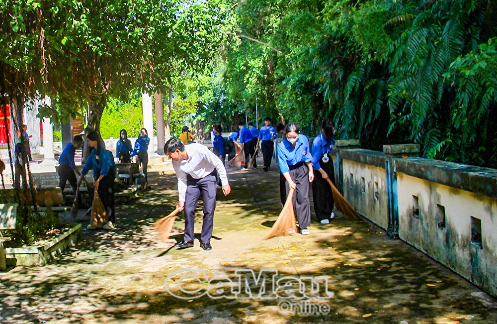 Thầy và trò Trường THPT Ninh Thạnh Lợi tham gia dọn vệ sinh trong khuôn viên Căn cứ Cái Chanh.