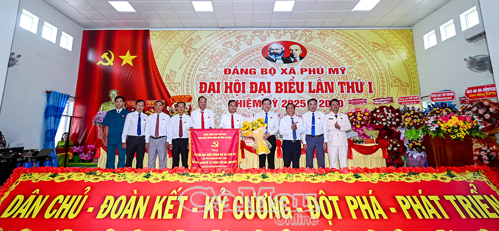 Đồng chí Lê Minh Ý, Uỷ viên BTV Tỉnh uỷ, Phó Trưởng ban Thường trực Ban Tổ chức Tỉnh uỷ, tặng hoa chúc mừng Ban Thường vụ, Ban Chấp hành, Uỷ ban Kiểm tra và Đoàn đại biểu đi dự Đại hội cấp trên của Đảng bộ xã Phú Mỹ, nhiệm kỳ 2025-2030.