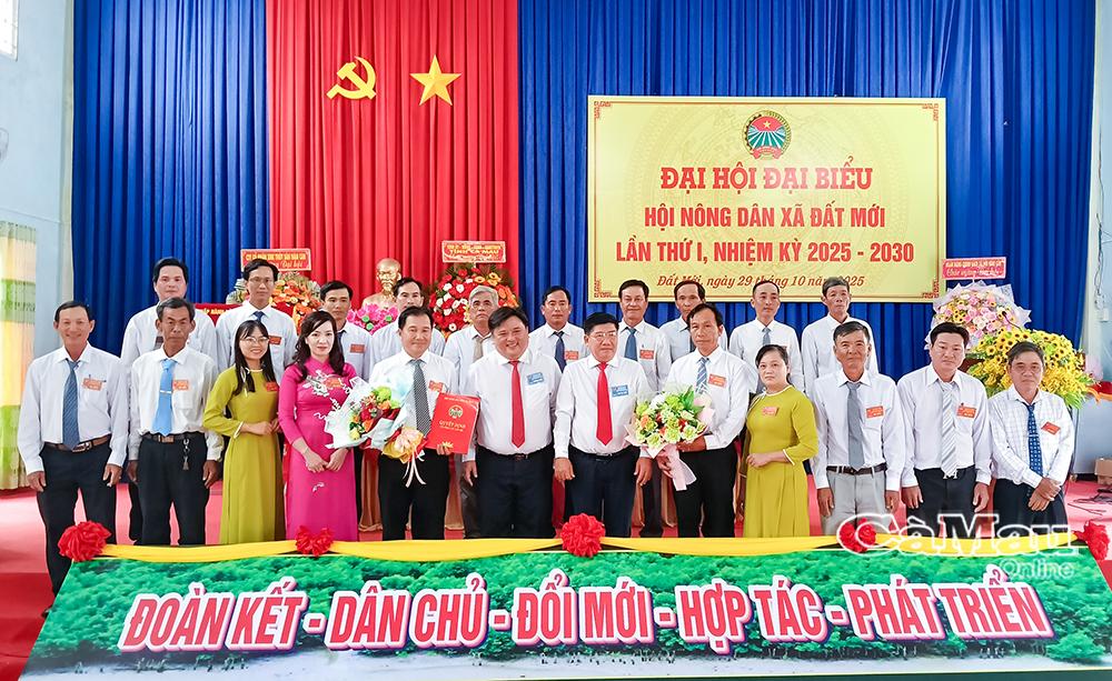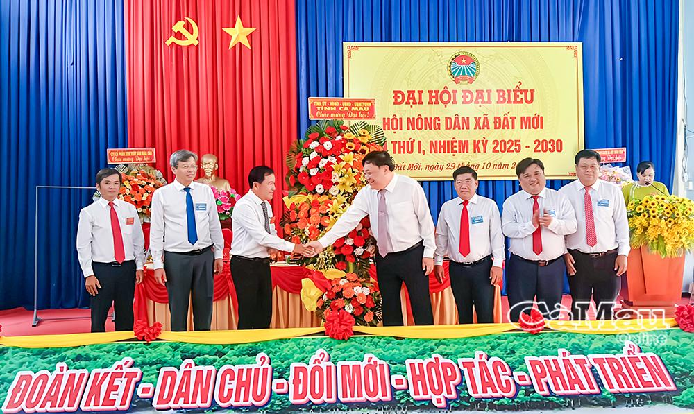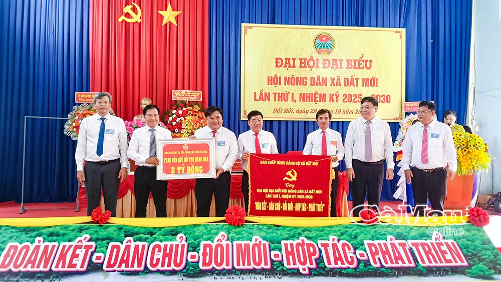 Đồng chí Nguyễn Hoàng Thoại, Chủ tịch Hội Nông dân tỉnh Cà Mau (thứ 3 từ trái sang); đồng chí Nguyễn Phương Đông, Bí thư Đảng uỷ, Chủ tịch HĐND xã Đất Mới (thứ 4 từ trái sang) trao bảng tượng trưng 2 tỷ đồng Quỹ Hỗ trợ nông dân cho Hội Nông dân xã và bức trướng chúc mừng đại hội.