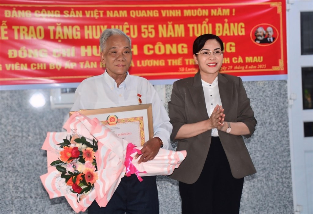 Phó Chủ tịch HĐND tỉnh Lê Thị Nhung trao huy hiệu 55 năm tuổi Đảng cho đảng viên Huỳnh Công Bằng.