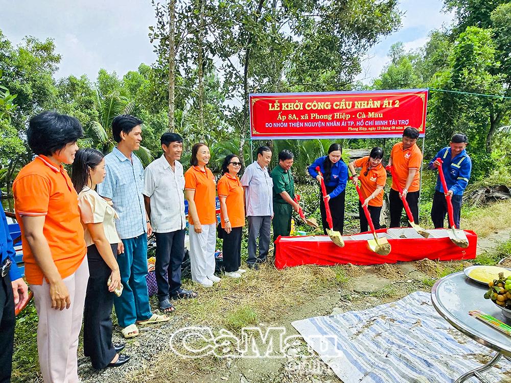 Đại diện Uỷ Ban MTTQ Việt Nam xã Phong Hiệp cùng nhóm thiện nguyện Nhân Ái thực hiện nghi thức động thổ xây dựng cầu.