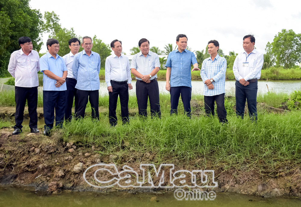 Lãnh đạo Trung ương và tỉnh Cà Mau tham quan mô hình sản xuất lúa - tôm mang lại thu nhập ổn định, hiệu quả bền vững của nông dân Phường Giá Rai. (Ảnh: Hữu Thọ)