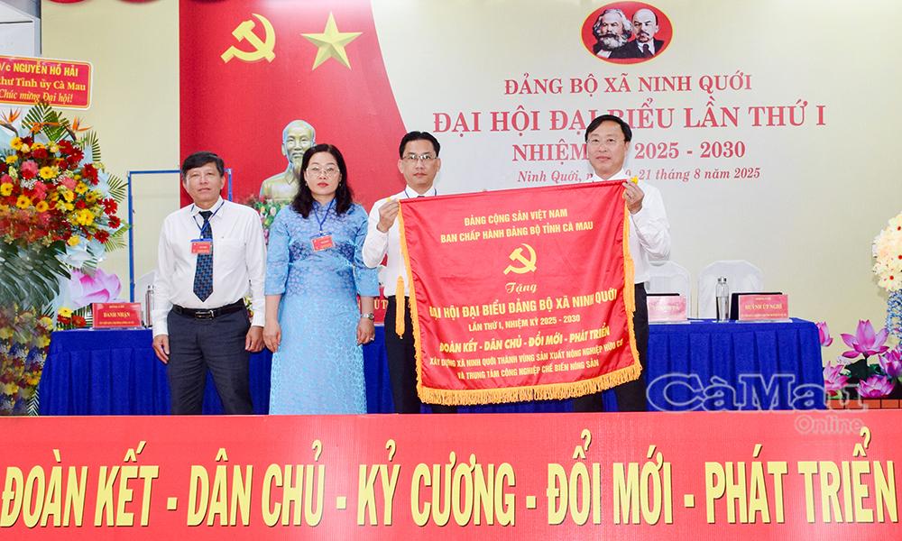 Thay mặt Ban Chấp hành Đảng bộ tỉnh Cà Mau, Uỷ viên Ban Thường vụ Tỉnh uỷ, Phó Chủ tịch UBND tỉnh Huỳnh Hữu Trí trao tặng bức trướng chúc mừng Đại hội với dòng chữ “Đoàn kết - Dân chủ - Đổi mới - Phát triển”, xây dựng xã Ninh Quới thành vùng sản xuất nông nghiệp hữu cơ và trung tâm công nghiệp chế biến nông sản.