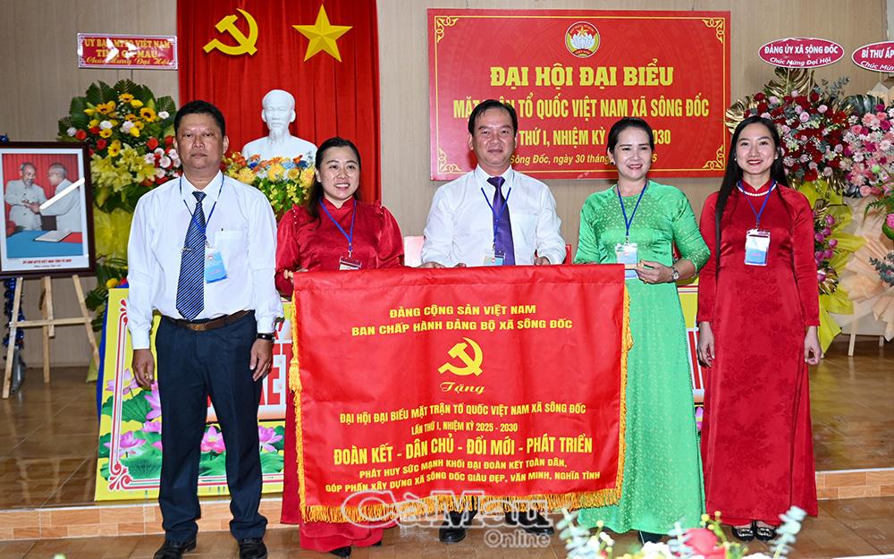 Đồng chí Mã Minh Tâm, Bí thư Đảng uỷ, Chủ tịch HĐND xã Sông Đốc trao tặng đại hội bức trướng mang dòng chữ “Đoàn kết - Đổi mới - Dân chủ - Phát triển”; phát huy sức mạnh khối đại đoàn kết toàn dân, góp phần xây dựng xã Sông Đốc giàu đẹp, văn minh, nghĩa tình.