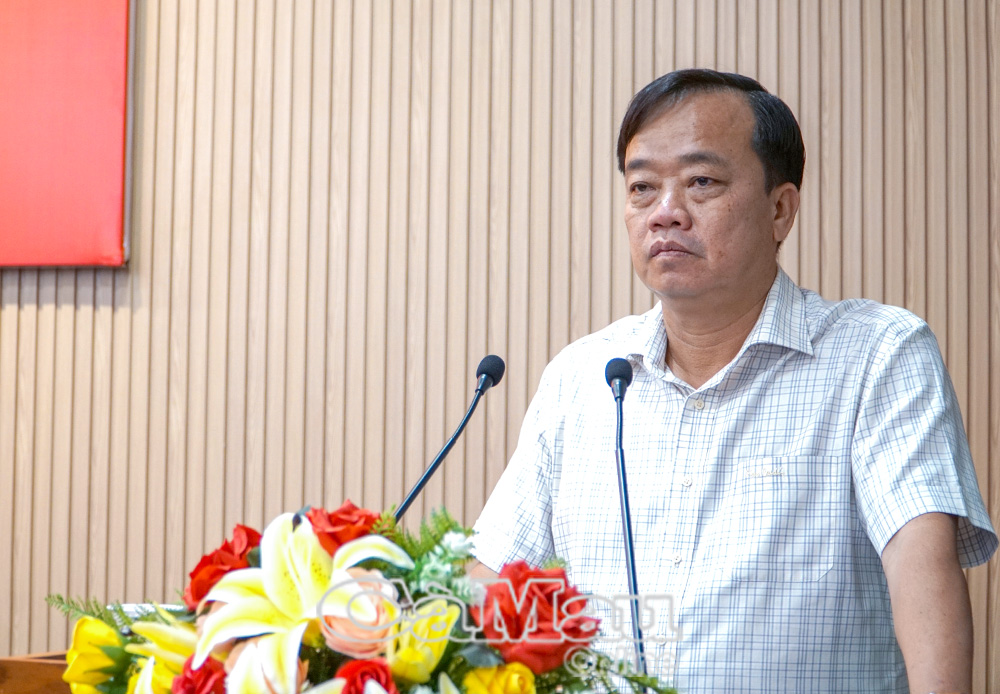 Uỷ viên Ban Thường vụ Tỉnh uỷ, Phó Chủ tịch UBND tỉnh Nguyễn Minh Luân trình bày chuyên đề: "Định hướng mục tiêu, nhiệm vụ, giải pháp phát triển các lĩnh vực văn hoá - xã hội" tại hội nghị.