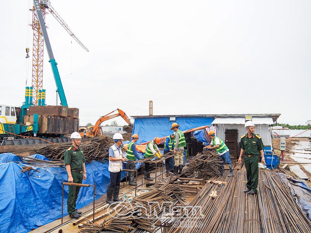 Thượng tá Đỗ Quang Tuấn (bìa phải), Chỉ huy trưởng liên danh thi công Công trình Bệnh viện Đa khoa tỉnh Cà Mau, thuộc Tổng Công ty 319 - Bộ Quốc phòng, cùng lãnh đạo công ty kiểm tra, động viên công nhân đang thi công trên công trường.