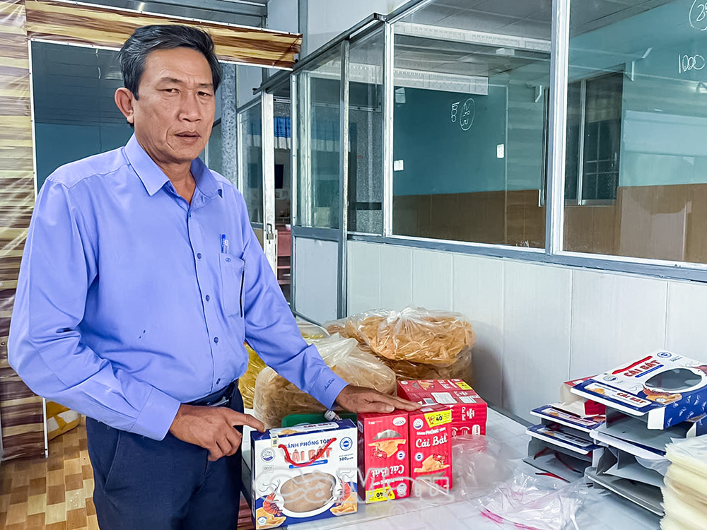 Ông Nguyễn Hoàng Ân, Chủ tịch HĐQT HTX Cái bát, giới thiệu sản phẩm bánh phồng tôm Cái Bát - món quà tập thể HTX dâng lên đại hội.