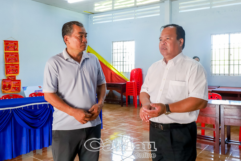 Đồng chí Nguyễn Minh Luân trao đổi với đồng chí Đỗ Tài Đa, Bí thư Chi bộ kiêm Trưởng Ấp 3, Xã Nguyễn Phích, về phương án phục vụ cử tri trong ngày bầu cử.