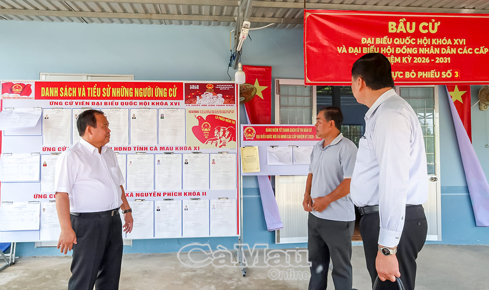 Tại xã Khánh An, đoàn công tác trực tiếp kiểm tra công tác chuẩn bị tại các tổ bầu cử Ấp 6 và Ấp 7. Nội dung kiểm tra tập trung vào việc bố trí thùng phiếu, khu vực niêm yết danh sách cử tri, danh sách ứng cử viên, công tác trang trí khánh tiết và sắp xếp không gian phòng bỏ phiếu. Qua kiểm tra cho thấy các tổ bầu cử cơ bản hoàn tất khâu chuẩn bị, việc bố trí được thực hiện khoa học, thuận tiện để cử tri đến thực hiện quyền và nghĩa vụ công dân.