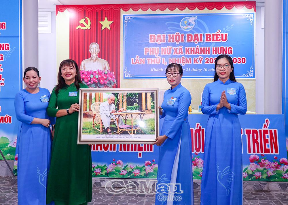 Đồng chí Nguyễn Thị Ngọc Thúy, Phó Chủ tịch Hội LHPN tỉnh Cà Mau (thứ 2 từ trái sang) tặng bức ảnh Bác Hồ, chúc mừng đại hội.