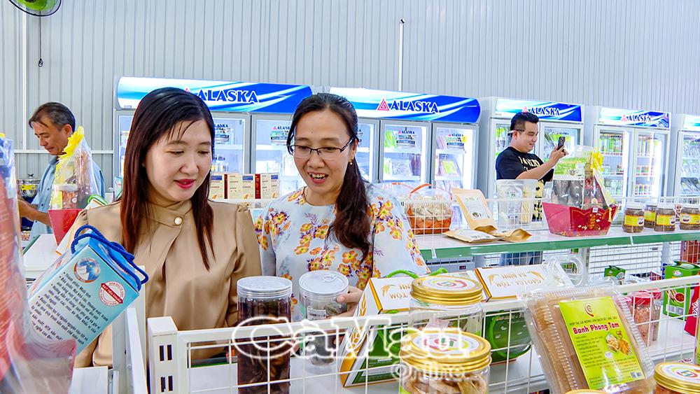 (Trong ảnh: Lãnh đạo Liên minh HTX tỉnh Cà Mau (bên phải) tham quan cửa hàng trưng bày các sản phẩm OCOP – đặc sản vùng miền trên cả nước, tại đường Trần Hưng Đạo, phường Tân Thành, nhân dịp khai trương ngày 24/9/2025)