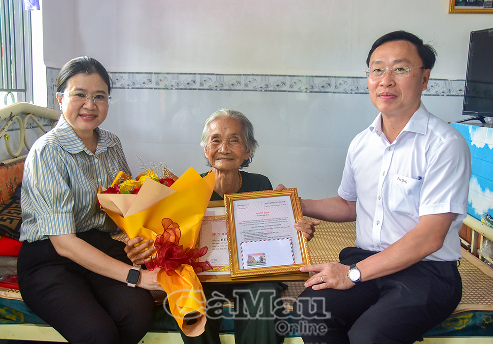 Bí thư Đảng uỷ xã Châu Thới Trương Ngọc Thảo tặng quà chúc mừng, tri ân đảng viên cao niên, Mẹ Việt Nam anh hùng Huỳnh Thị Sến.