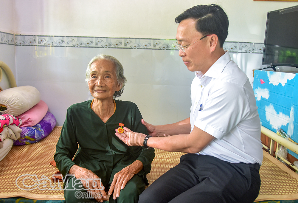 Đồng chí Huỳnh Hữu Trí trao Huy hiệu 65 năm tuổi Đảng cho Mẹ Việt Nam anh hùng Huỳnh Thị Sến.