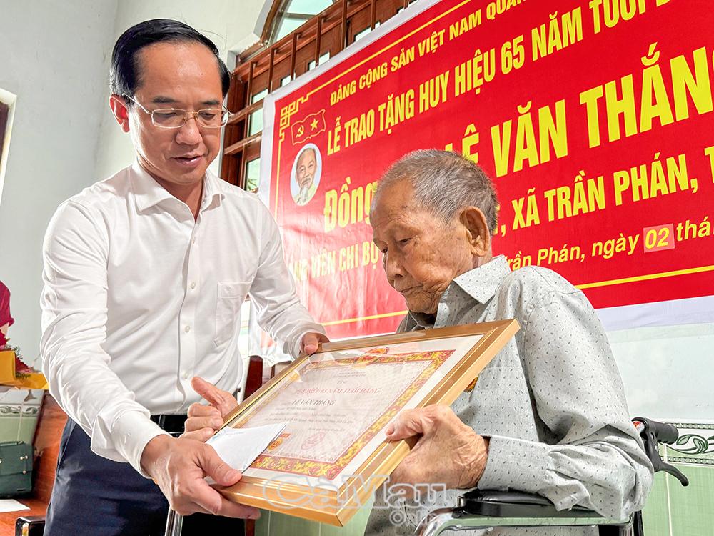 Đồng chí Hồ Thanh Thuỷ, Phó Bí thư Tỉnh uỷ, Chủ tịch Uỷ ban MTTQ Việt Nam tỉnh Cà Mau ,trao Huy hiệu 65 năm tuổi Đảng cho đồng chí Trương Văn Mạnh.