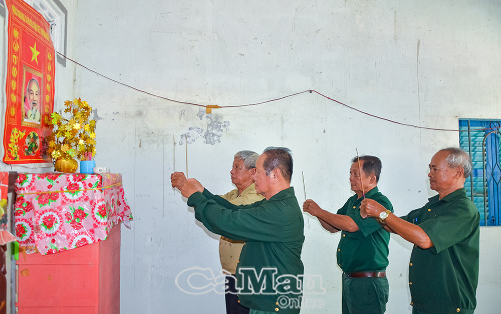 Thương binh Nguyễn Văn Ân và các hội viên Chi hội Cựu chiến binh ấp Cai Giảng thắp hương bàn thờ Bác Hồ.