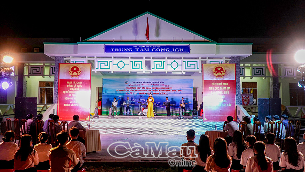 Trong không khí phấn khởi của năm mới 2026, hướng về Cuộc bầu cử đại biểu Quốc hội khoá XVI và đại biểu HĐND các cấp nhiệm kỳ 2026-2031, tối 1/3, tại Trung tâm Công ích xã Đất Mũi, Trung tâm Văn hoá tỉnh Cà Mau phối hợp UBND xã Đất Mũi tổ chức Chương trình nghệ thuật lưu động tuyên truyền cổ động với chủ đề “Ngày hội non sông”.