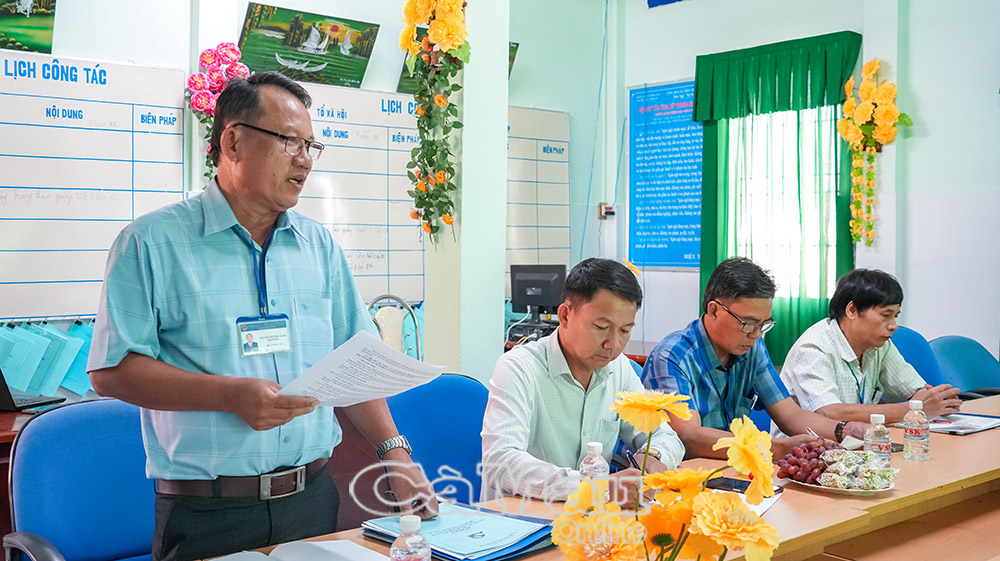 Bí thư Chi bộ Trường THCS Vĩnh Lộc Nguyễn Trường Giang báo cáo kết quả việc thực hiện các nghị quyết quan trọng của Bộ Chính trị.
