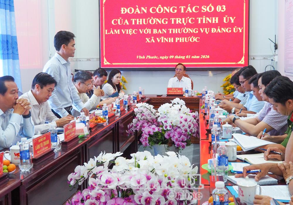 Báo cáo với đoàn công tác, đồng chí Trần Văn Liêm, Bí thư Đảng uỷ xã Vĩnh Phước cho biết, địa phương đã hoàn thành 15/15 chỉ tiêu năm 2025, trong đó có 9 chỉ tiêu vượt kế hoạch; đồng thời hoàn thành 19/19 chỉ tiêu Nghị quyết Đại hội Đảng bộ xã nhiệm kỳ 2020-2025, tạo tiền đề vững chắc thực hiện các mục tiêu Nghị quyết nhiệm kỳ 2025-2030.