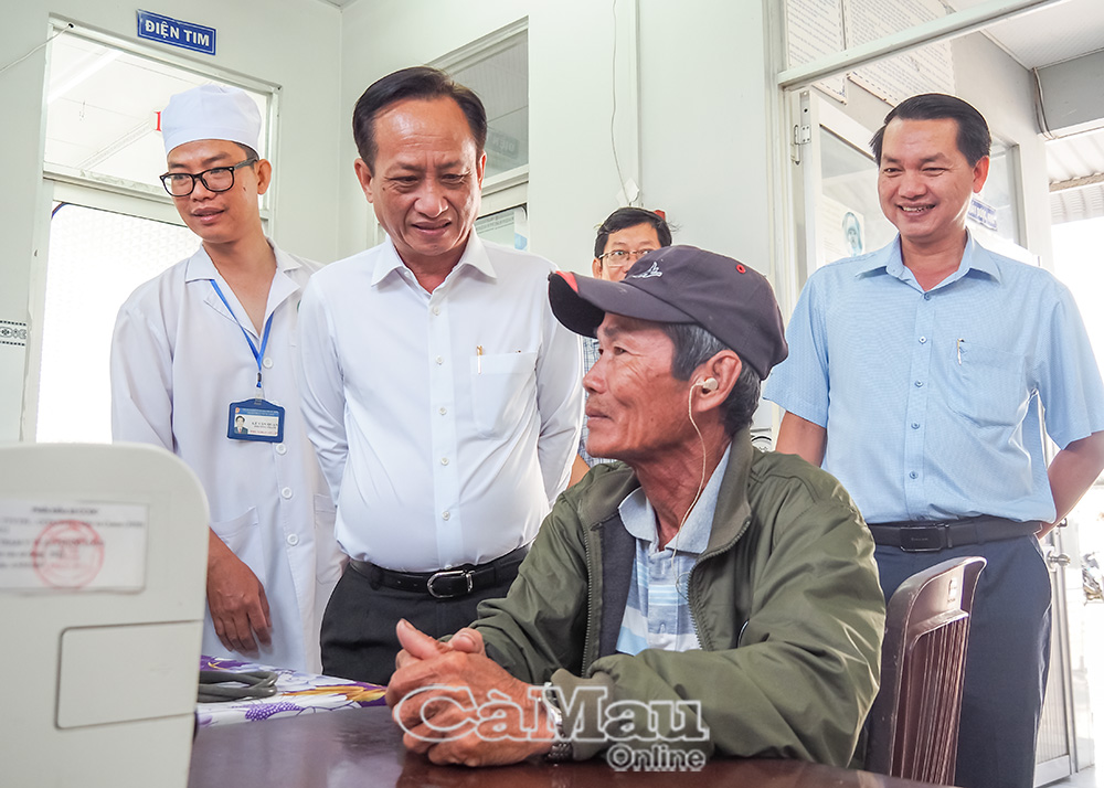 Đồng chí Phạm Văn Thiều thăm hỏi bệnh nhân đến khám và điều trị bệnh tại Trạm Y tế xã Vĩnh Phước.
