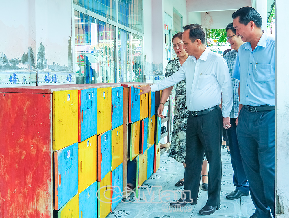 Đoàn khảo sát thực tế cơ sở vật chất tại Trường Mầm non A Vĩnh Phú Tây.