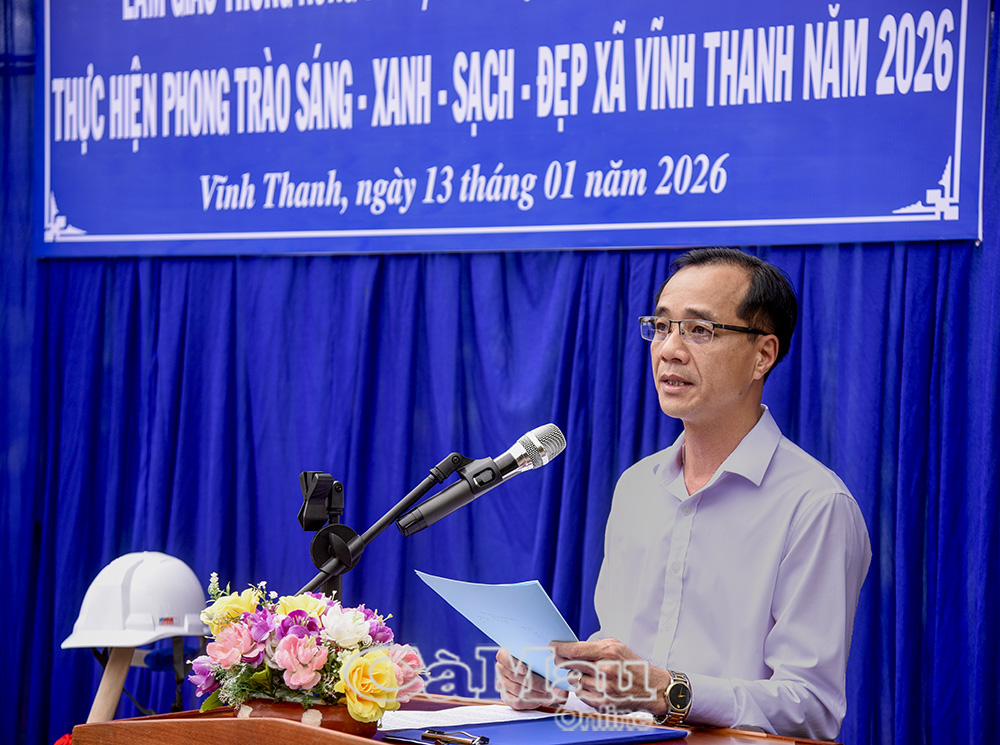 Tại buổi lễ, UBND xã Vĩnh Thanh triển khai kế hoạch thực hiện các công trình trọng điểm năm 2026 với các mục tiêu, chỉ tiêu cụ thể. Trong lĩnh vực giao thông nông thôn, xã phấn đấu hoàn thành trong quý II việc nâng cấp, xây mới 10 tuyến đường giao thông trọng điểm; đồng thời duy tu, sửa chữa 6 tuyến lộ liên ấp, ngõ xóm, từng bước hoàn thiện hệ thống hạ tầng giao thông đồng bộ, phục vụ phát triển kinh tế - xã hội và nâng cao đời sống Nhân dân.