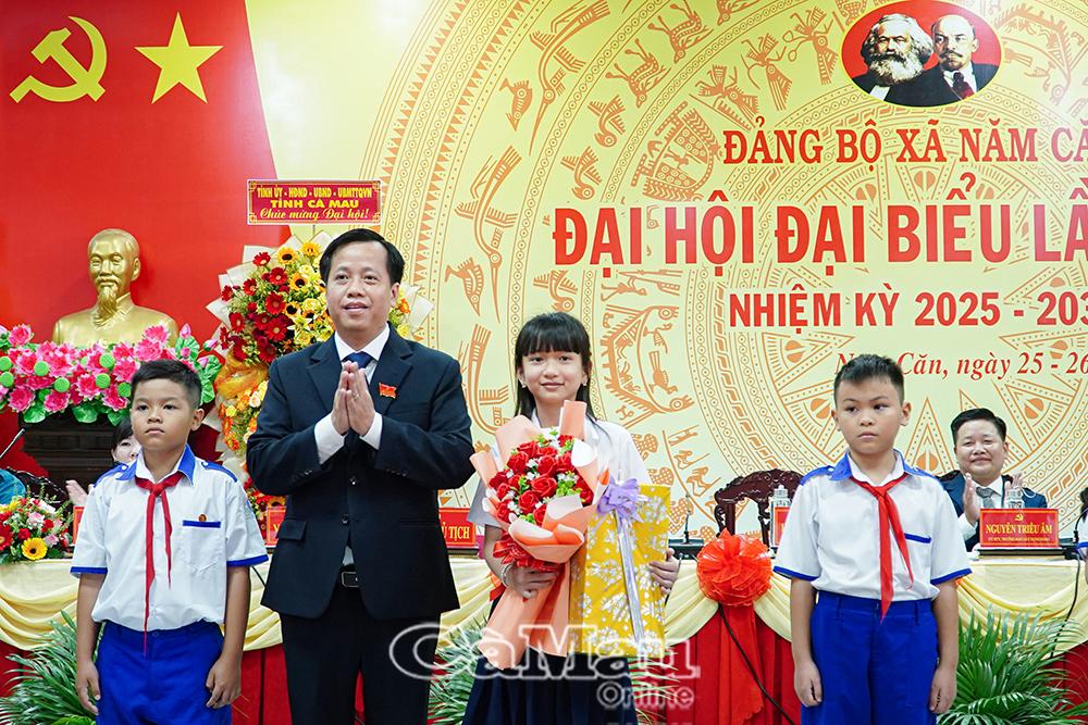 Thay mặt Ban Chấp hành Đảng bộ tỉnh, đồng chí Trần Hữu Phước, Uỷ viên Ban Thường vụ Tỉnh uỷ, Giám đốc Sở Nội vụ Cà Mau, trao tặng bức trướng chúc mừng Đại hội Đảng bộ xã Năm Căn.