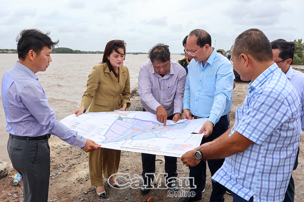 Ðồng chí Nguyễn Hồ Hải, Bí thư Tỉnh uỷ (thứ 2 từ phải sang) và các thành viên đoàn công tác tỉnh kiểm tra tình hình phát triển kinh tế - xã hội và khảo sát thực tế tại Cảng Năm Căn (địa bàn xã Năm Căn), ngày 3/4/2025.