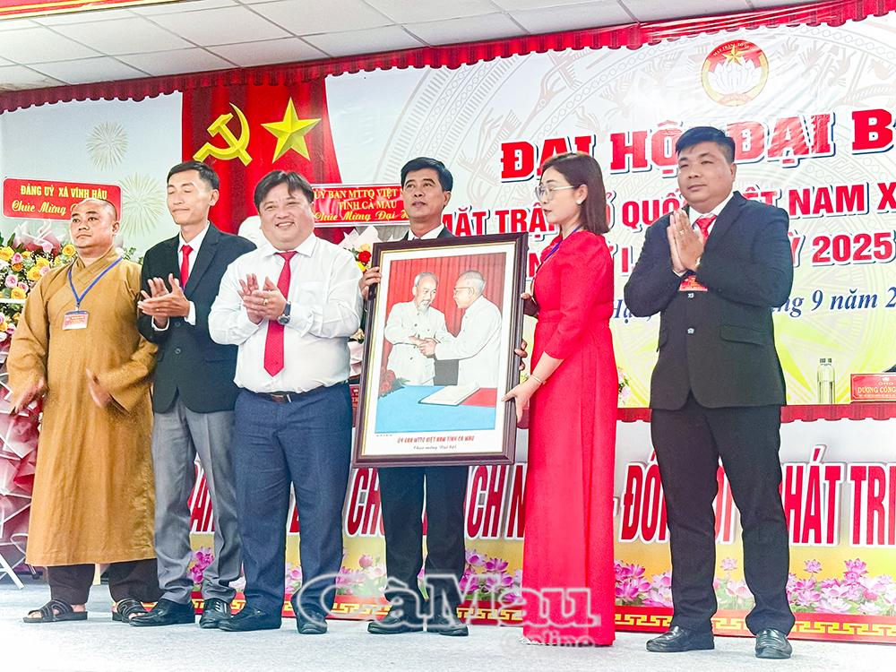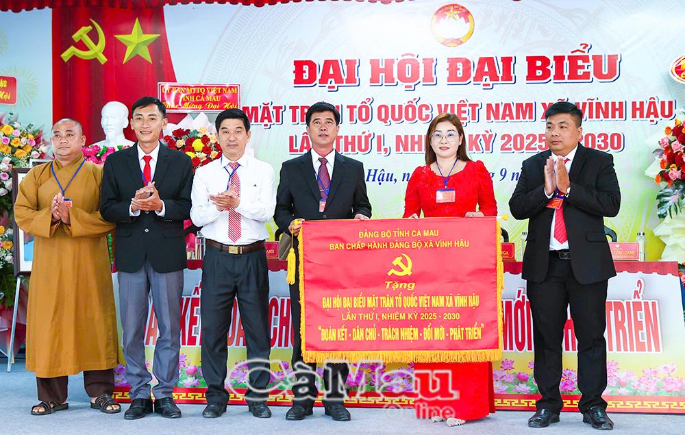 Đồng chí Trần Thanh Hiền, Phó Bí thư Đảng uỷ xã Vĩnh Hậu, trao tặng đại hội bức trướng với dòng chữ “Đoàn kết - Dân chủ - Trách nhiệm - Đổi mới - Phát triển”.