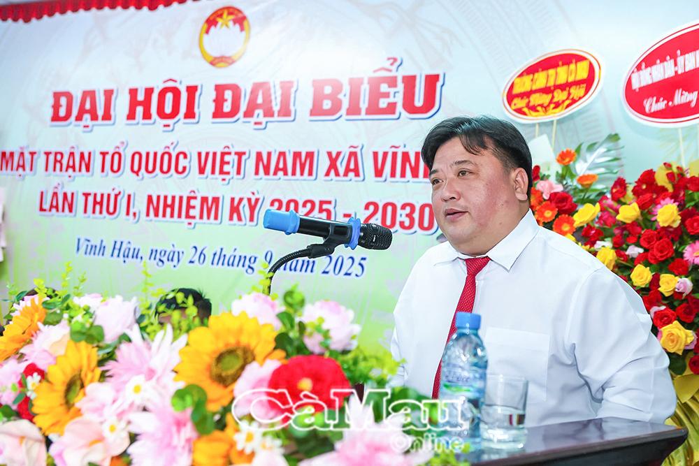 Phát biểu tại Đại hội, đồng chí Nguyễn Hoàng Thoại, Phó Chủ tịch Uỷ ban MTTQ Việt Nam tỉnh, đề nghị trong nhiệm kỳ mới MTTQ xã Vĩnh Hậu và các tổ chức thành viên tiếp tục quán triệt, triển khai hiệu quả chủ trương của Đảng, Nhà nước về xây dựng khối đại đoàn kết toàn dân tộc. Đồng thời, cần nâng cao vai trò đại diện, bảo vệ quyền và lợi ích hợp pháp, chính đáng của Nhân dân; đẩy mạnh giám sát, phản biện xã hội, góp ý xây dựng Đảng, chính quyền; tăng cường phòng, chống tham nhũng, lãng phí, phát huy dân chủ. Bên cạnh đó, cần tiếp tục lan tỏa các phong trào, cuộc vận động trong Nhân dân, hỗ trợ sinh kế cho hộ nghèo, cận nghèo, hộ khó khăn, góp phần đảm bảo an sinh xã hội trên địa bàn.
