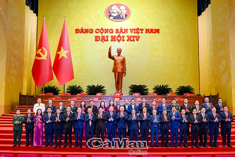 Đoàn đại biểu Đảng bộ tỉnh Cà Mau chụp ảnh lưu niệm cùng lãnh đạo Trung ương tại Đại hội XIV của Đảng. Ảnh: KIÊN GIANG - MINH LUÂN