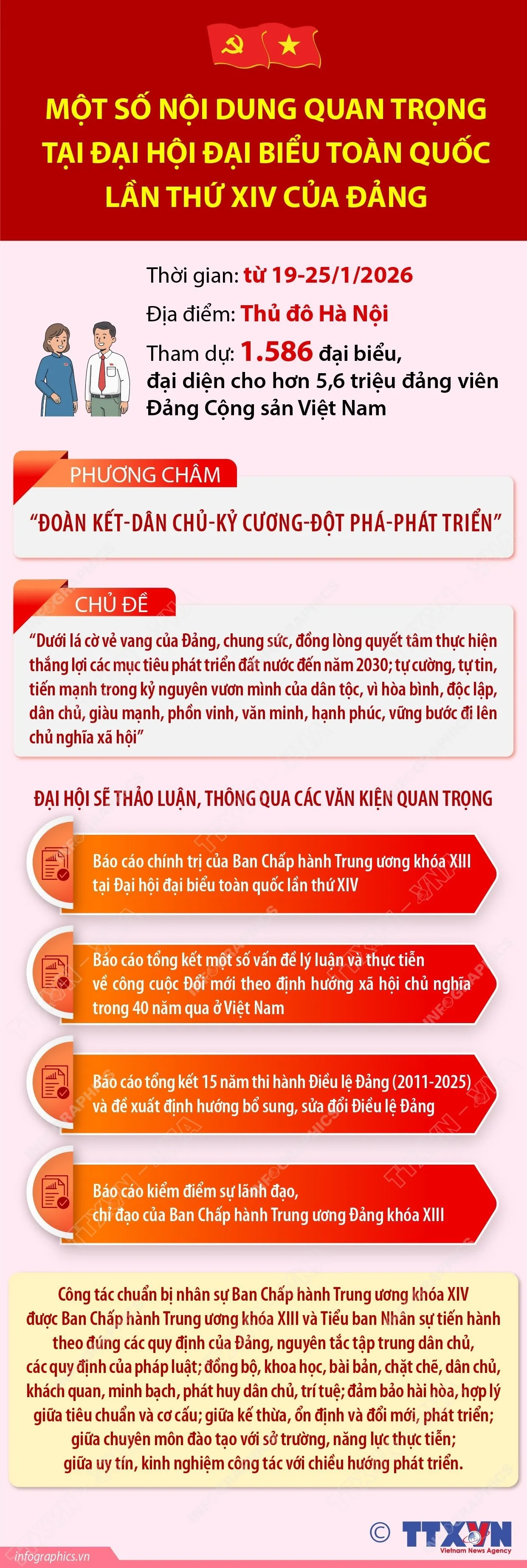 Với phương châm “Đoàn kết-Dân chủ-Kỷ cương-Đột phá-Phát triển," Đại hội đại biểu toàn quốc lần thứ XIV của Đảng sẽ diễn ra tại Thủ đô Hà Nội, từ ngày 19-25/1/2026, với sự tham dự của 1.586 đại biểu, đại diện cho hơn 5,6 triệu đảng viên Đảng Cộng sản Việt Nam.