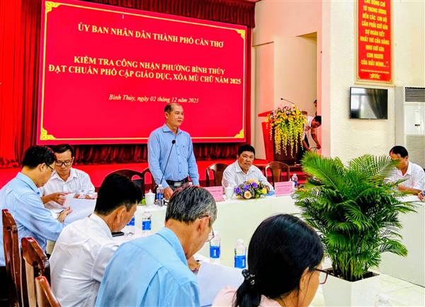 Chiều ngày 2/12, Đoàn kiểm tra phổ cập giáo dục, xoá mù chữ của Sở Giáo dục và Đào tạo TP Cần Thơ đã đến kiểm tra, đánh giá kết quả thực hiện nhiệm vụ năm 2025 tại phường Bình Thuỷ. Tiếp và làm việc với đoàn có ông Nguyễn Việt Quân, Phó Chủ tịch Thường trực UBND phường, Trưởng Ban Chỉ đạo công tác phổ cập giáo dục, xoá mù chữ phường.