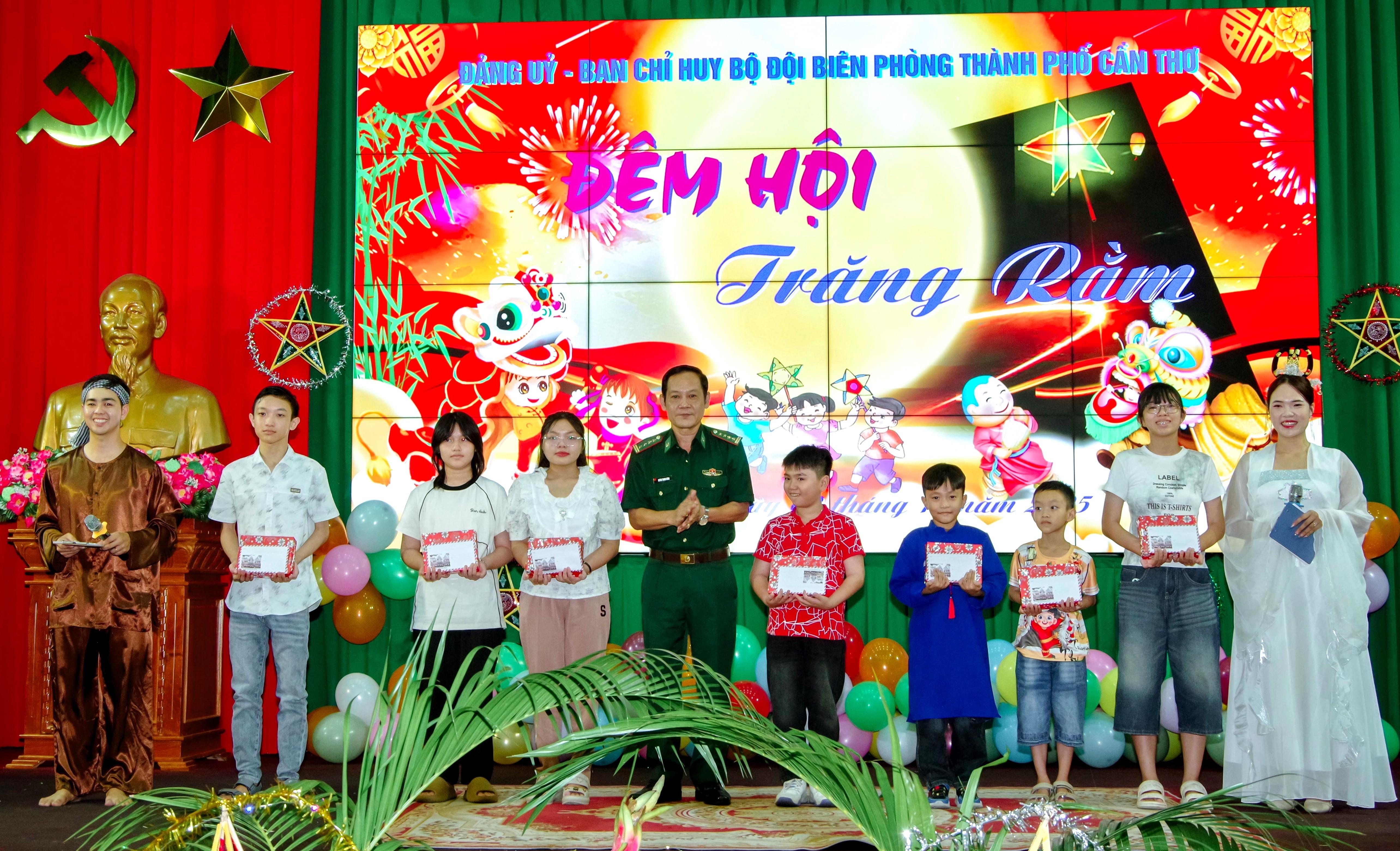 Đại tá Huỳnh Thanh Hùng, Chính ủy BĐBP TP Cần Thơ trao học bổng và quà trung thu cho các em học sinh đạt thành tích cao trong học tập.