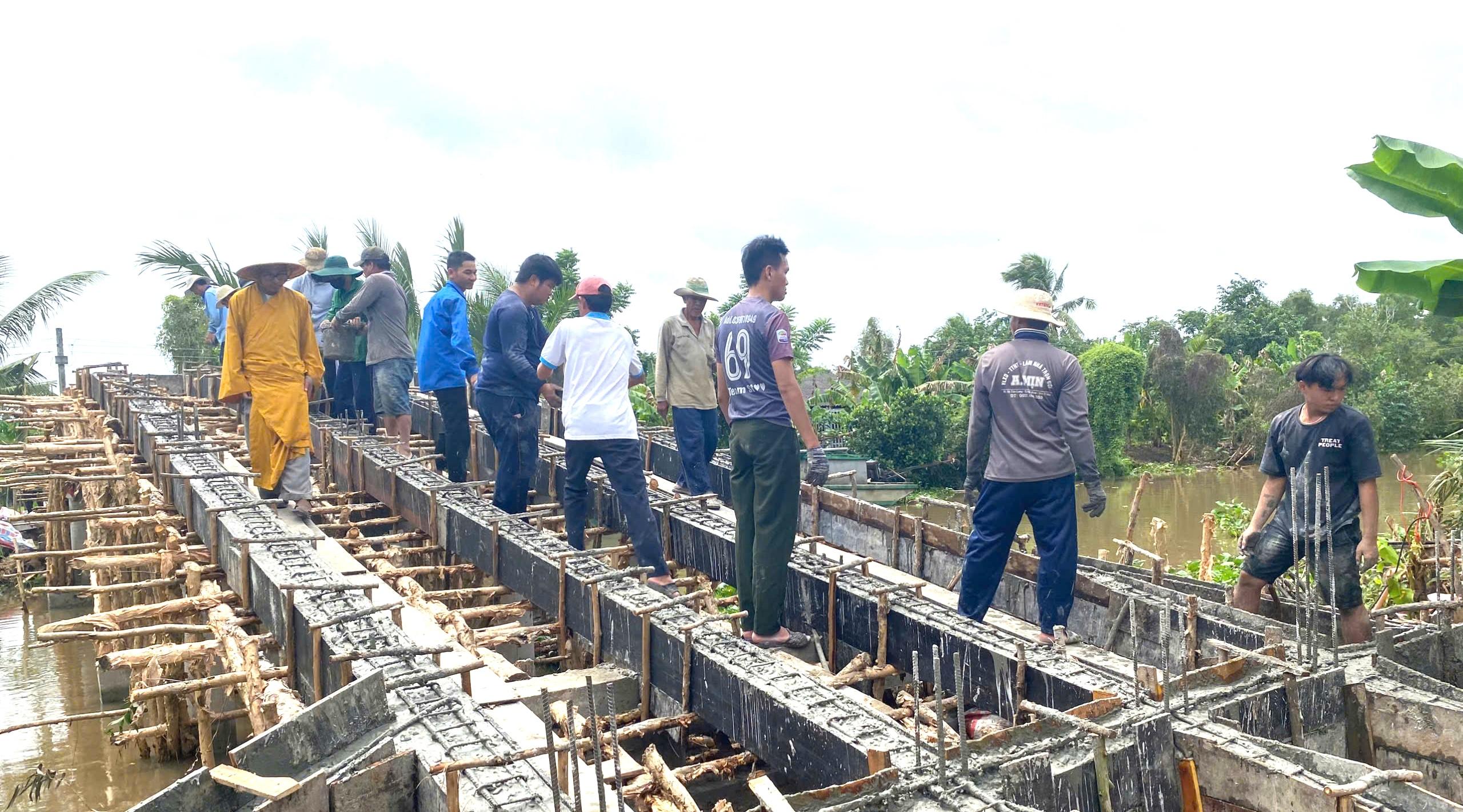 Thượng tọa Thích Định Hương cùng người dân địa phương trên công trình thi công cầu giao thông nông thôn.