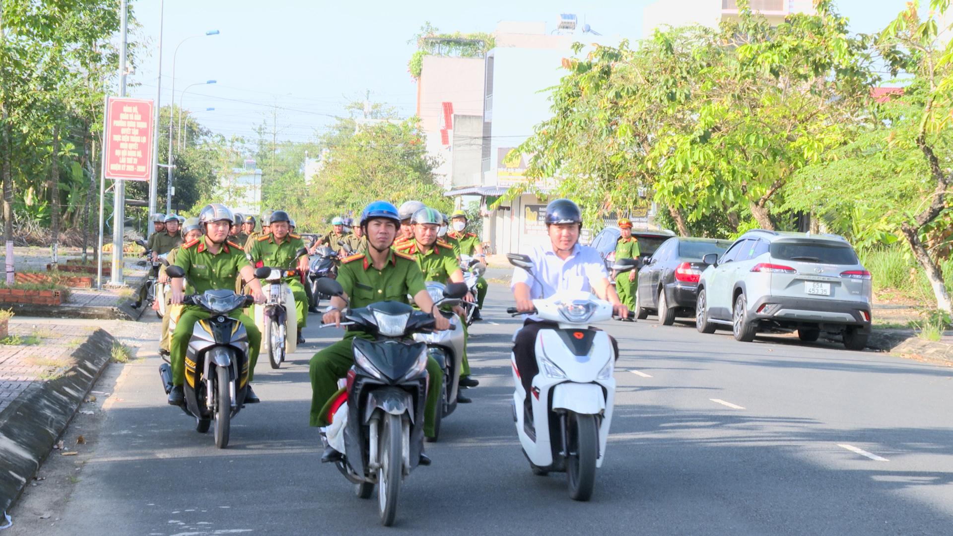 Lực lượng cán bộ, chiến sĩ công an phường Cái Răng và và lực lượng tham gia bảo vệ an ninh trật tự ở cơ sở tiến hành diễu hành tuyên truyền toàn dân tích cực tham gia phòng, chống tôi phạm.