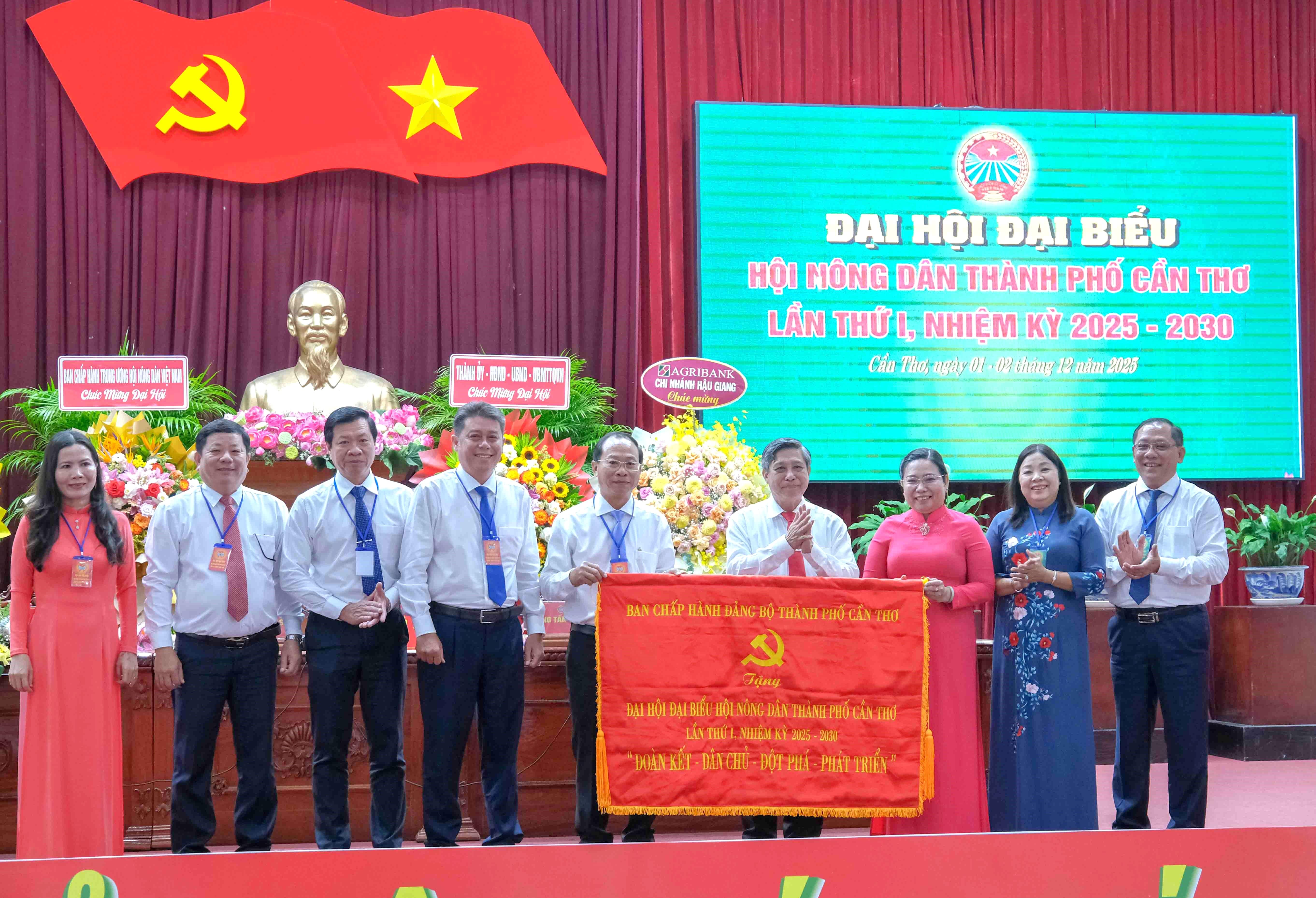 Lãnh đạo Thành ủy trao tặng Bức trướng của Ban Chấp hành Đảng bộ thành phố cho Hội Nông dân thành phố Cần Thơ.