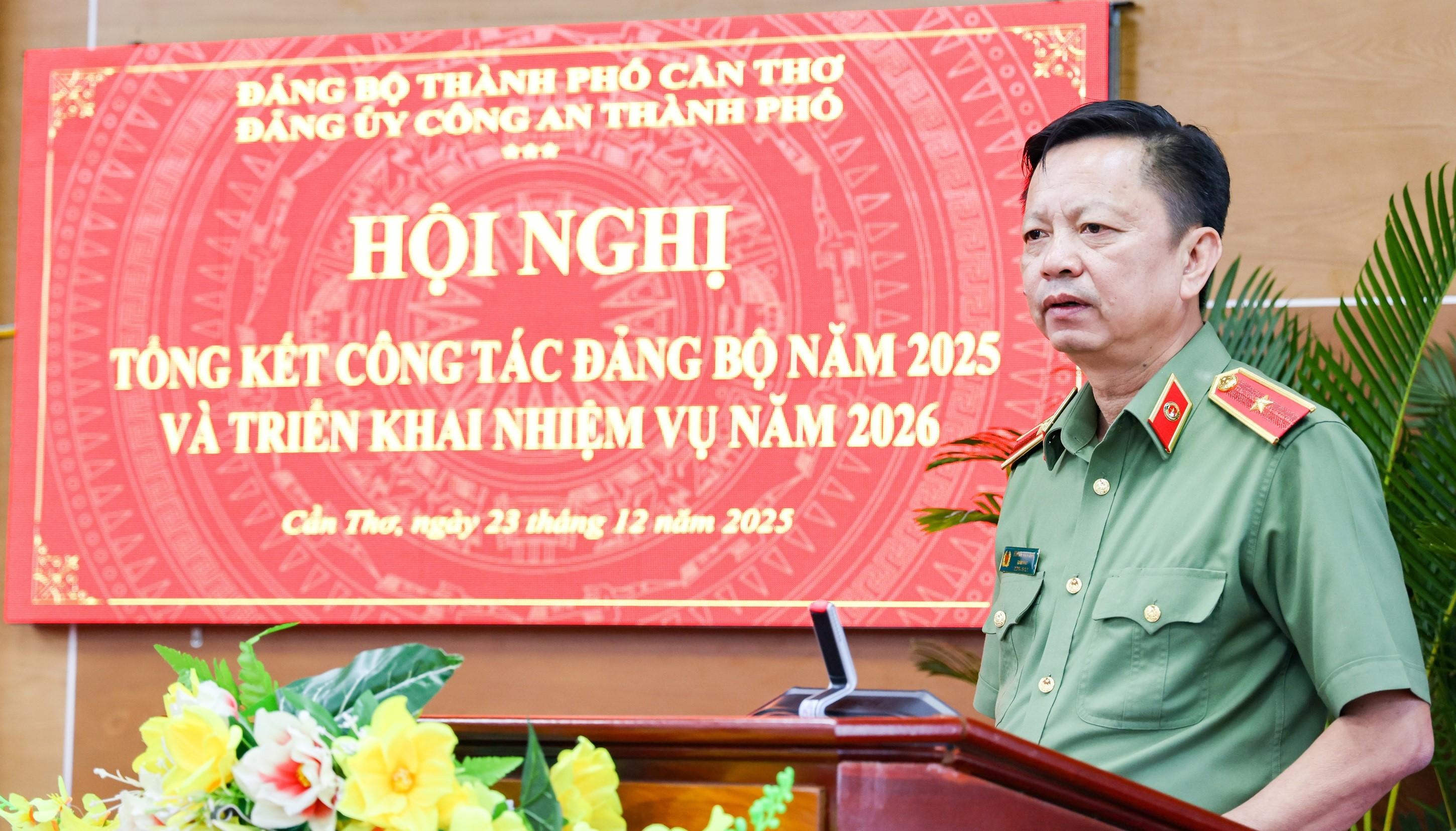 Phát biểu kết luận hội nghị, Thiếu tướng Huỳnh Việt Hòa, Ủy viên Ban Thường vụ Thành ủy, Bí thư Đảng ủy, Giám đốc Công an thành phố chỉ đạo tiếp tục nâng cao năng lực lãnh đạo, sức chiến đấu của các cấp ủy, tổ chức đảng là yêu cầu xuyên suốt; kịp thời quán triệt, cụ thể hóa và tổ chức thực hiện nghiêm túc, hiệu quả các quan điểm, chủ trương của Đảng về bảo đảm an ninh, trật tự và xây dựng lực lượng Công an nhân dân. Cùng với đó, tập trung lãnh đạo xây dựng xã hội trật tự, kỷ cương, an toàn, lành mạnh, phát huy sức mạnh tổng hợp của cả hệ thống chính trị và Nhân dân trong phòng, chống tội phạm, chủ động phòng ngừa, xử lý các vấn đề phát sinh ngay từ cơ sở. Việc đổi mới phương thức quản lý, quản trị an ninh, trật tự theo hướng hiện đại, minh bạch, hiệu quả, vì Nhân dân phục vụ gắn với đẩy mạnh cải cách hành chính, ứng dụng khoa học - công nghệ tiếp tục được xác định là nhiệm vụ trọng tâm. Xây dựng lực lượng thật sự trong sạch, vững mạnh, chính quy, tinh nhuệ, hiện đại, gắn công tác xây dựng lực lượng với xây dựng Đảng bộ trong sạch, vững mạnh toàn diện; đồng thời chú trọng đổi mới phương pháp, phong cách lãnh đạo theo hướng sâu sát, quyết liệt, nói đi đôi với làm, phát huy hiệu quả công tác dân vận và Phong trào Toàn dân bảo vệ an ninh Tổ quốc, đáp ứng yêu cầu nhiệm vụ trong tình hình mới.