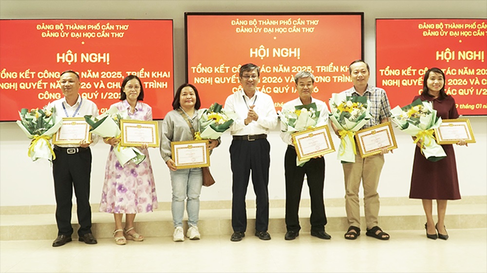 Dịp này, 4 tổ chức cơ sở Đảng nhận giấy khen vì hoàn thành xuất sắc nhiệm vụ năm 2025; các cá nhân có đóng góp tích cực cho Đại hội Đảng bộ ĐHCT và 20 cá nhân đạt giải Cuộc thi chính luận về bảo vệ nền tảng tư tưởng của Đảng năm 2025 được khen thưởng.