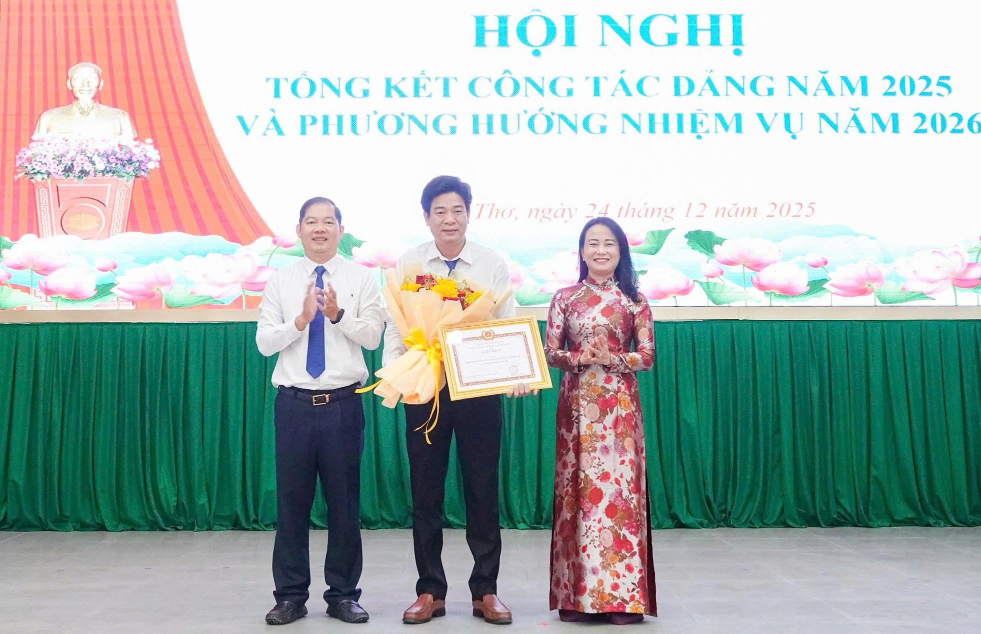 Ông Nguyễn Khánh Tùng, Thành ủy viên, Phó Bí thư chuyên trách Đảng ủy các cơ quan Đảng TP Cần Thơ và TS Nguyễn Thị Tuyết Loan, Thành ủy viên, Hiệu trưởng Trường Chính trị TP Cần Thơ, trao giấy khen đảng viên hoàn thành xuất sắc nhiệm vụ năm 2025.